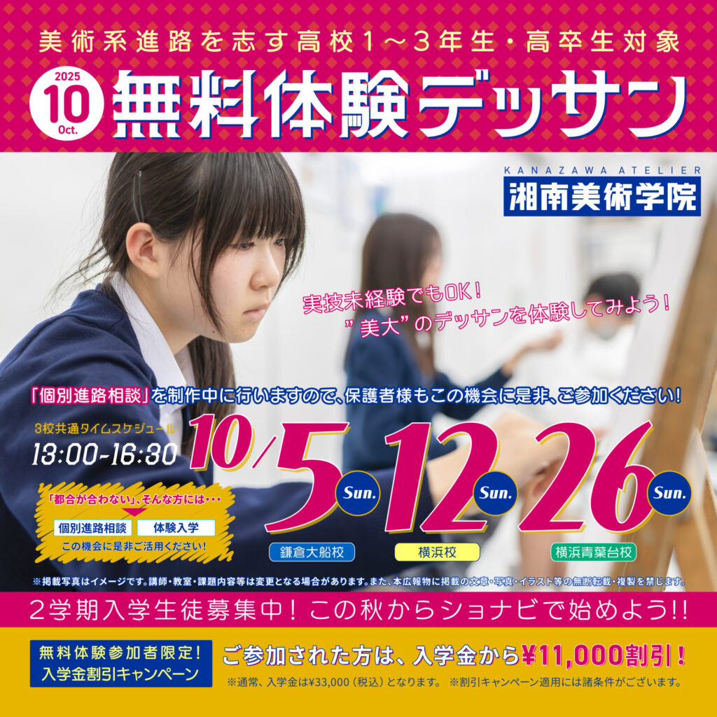 10月は、全3回の無料体験デッサンイベントを開催します!! 美術系の進路ガイダンスも行うので、「美大入試の第一歩」をまず…