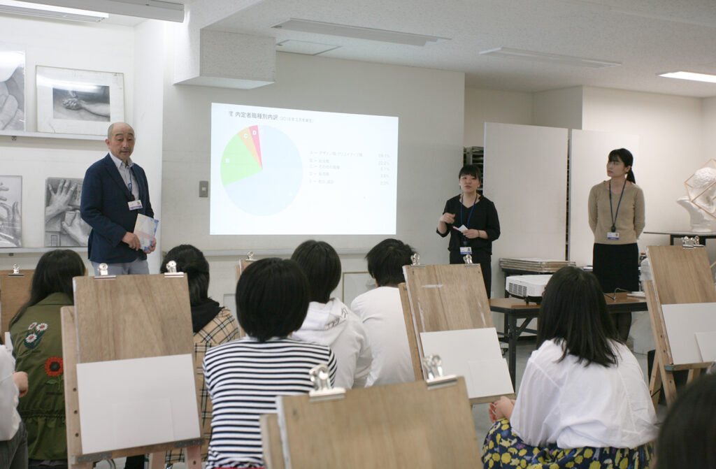 芸大・美大を志望する生徒・保護者様に、将来のイメージが具体的になるよう、各専攻科の特色や大学卒業後のさまざまな仕事、実際に社会で活躍する卒業生の紹介など、スライドショーを使いご説明します。
