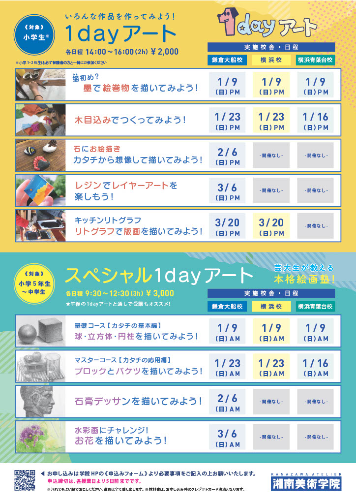 小学生対象ワンデイアート1〜3月のスケジュールが決定いたしました。