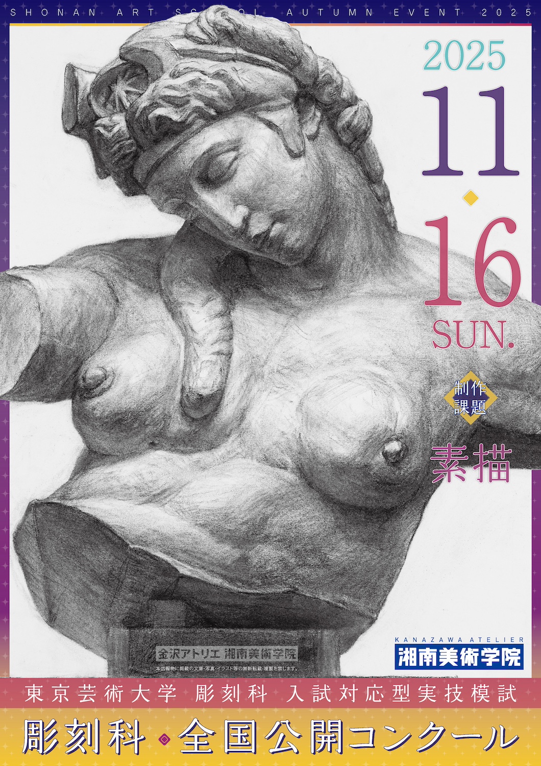 【彫刻科】11/16(日) 全国公開コンクールのお知らせ 2025年10月21日 イベント情報 11月16日(日)鎌倉大船校にて、東京藝術大学 彫刻科 入試対応型実技模試、彫刻科全国公開コンクールを開催いたします。 2学期の総まとめ、そして入試前最後の講習会に向け、自分の今の実力を把握し計画を立てていきましょう。1日完結型のイベントとなります。詳細、お申し込みはコンクールページよりご確認ください。皆様のご参加をお待ちしています。 詳細・お申し込みはこちらから URL Copied!