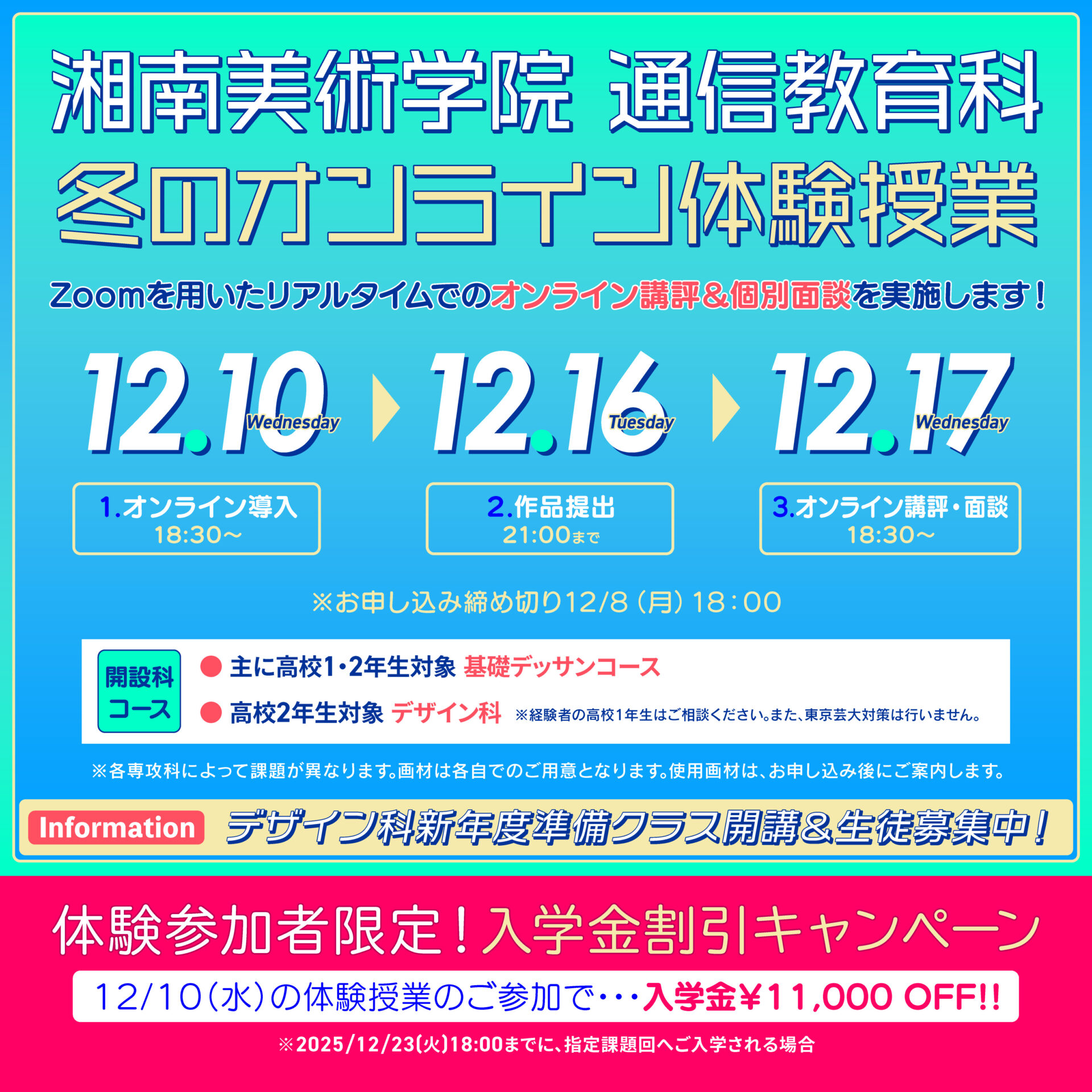 ※2025/12/23(火)18:00までに、1/6(火)配信の基礎デッサンコース第13回、またはデザイン科新年度準備クラス第1回課題へのご入学申し込みで対象となります。