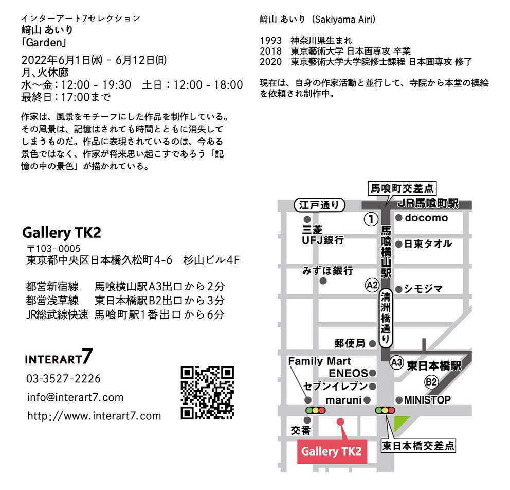 日本画科講師の崎山あいりさんが来月1日より日本橋GalleryTK2にて展示を開催いたします。12日迄。