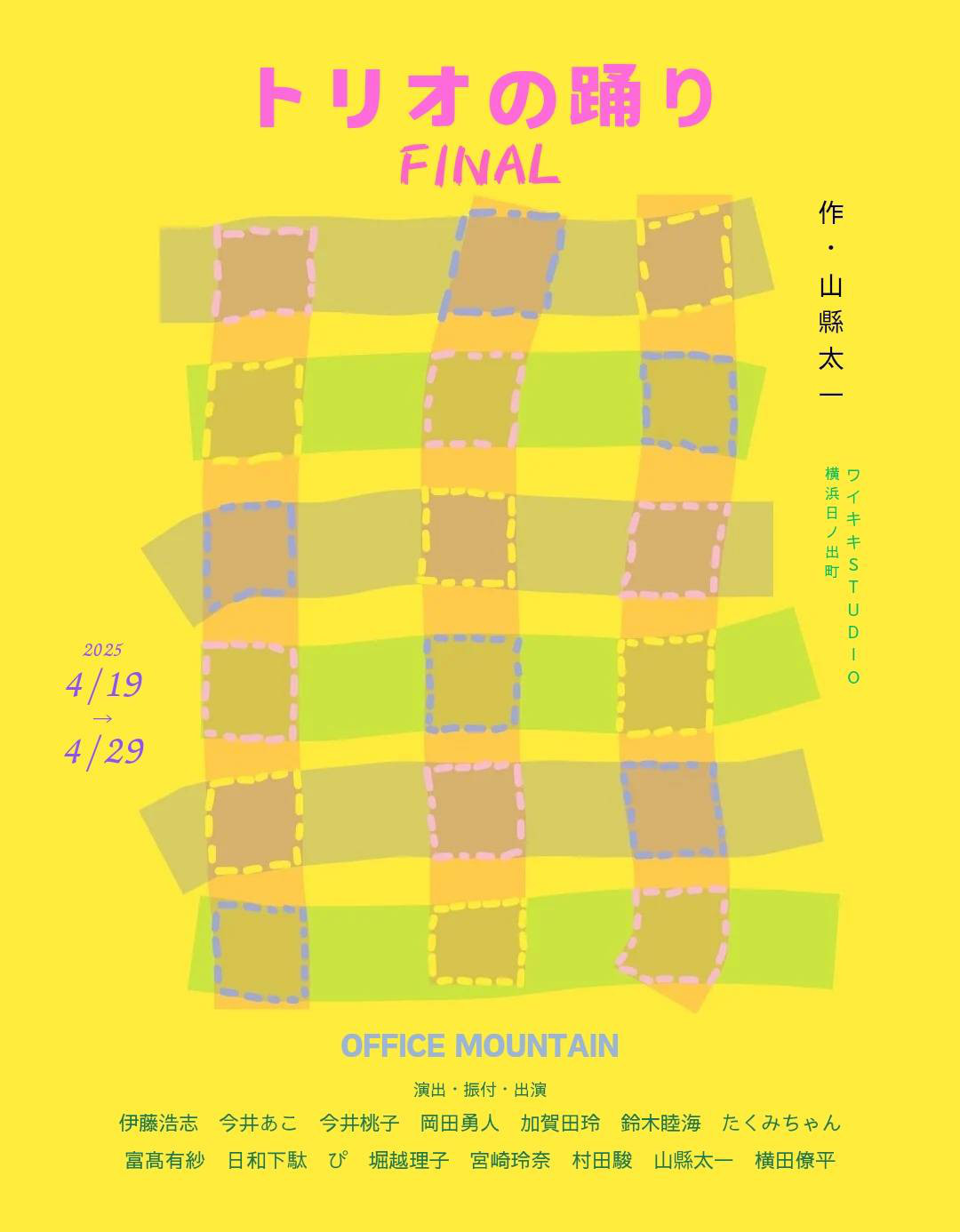 この度、演劇カンパニー オフィスマウンテンが『トリオの踊り』FINAL公演を行います。一年間取り組んできた『トリオの踊り』の集大成、新しいメンバーも加わっての公演です。ぜひ足をお運びいただければと思います。日ノ出町はちょうどお花見シーズンで、公演の時期には葉桜。お散歩もお楽しみいただけます。