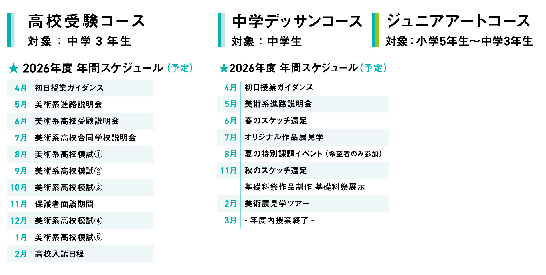 - 受験デッサン科は2学期までのカリキュラムとなります。