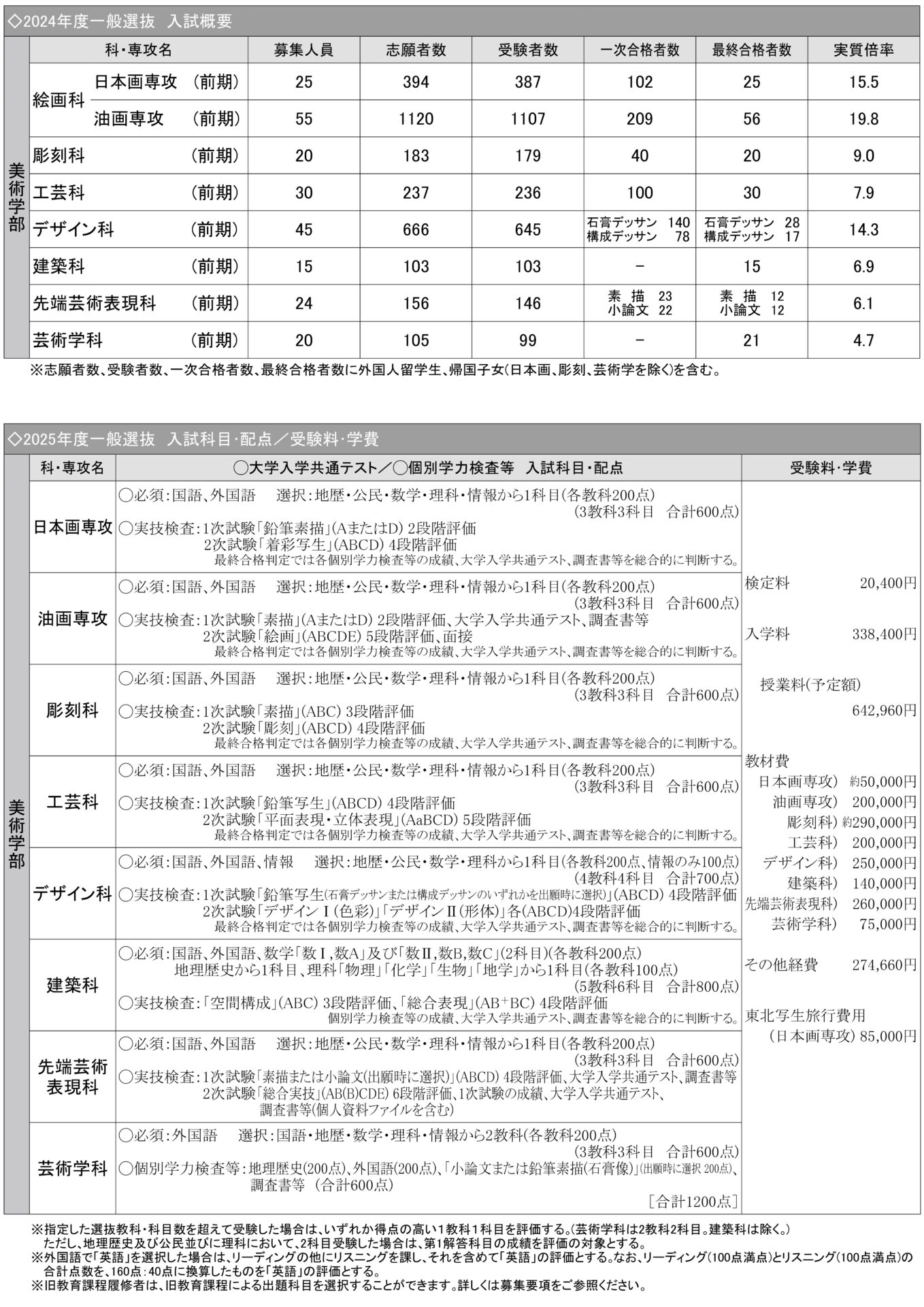 <基本情報> 上野キャンパス 〒110-8714 東京都台東区上野公園12-8 取手キャンパス 〒302-0001 茨城県取手市小文間5000番地 美術学部教務係 Tel. 050-5525-2122 他校舎:横浜キャンパス・千住キャンパス 各専攻科別 専門試験課題(過去問) 絵画科 日本画専攻 絵画科 油画専攻 彫刻科 工芸科 デザイン科 建築科 先端芸術表現科 芸術学科