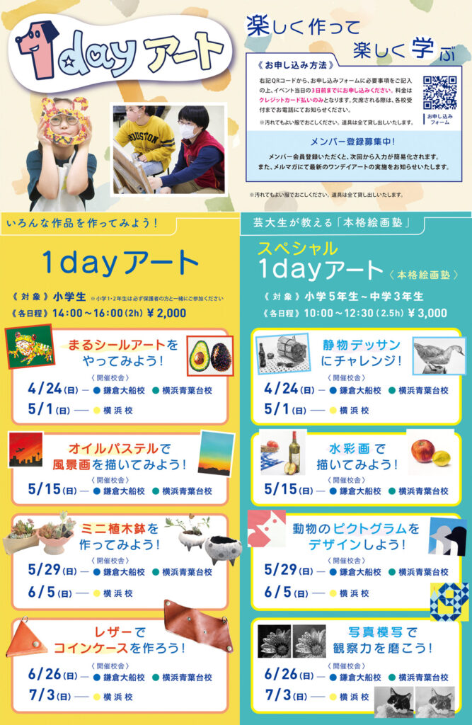 【小・中学生】1dayアート&スペシャル1dayアート 2022年5月2日 お知らせ イベント情報 ワンデイアート4〜7月のスケジュールが決定いたしました。作るのが好き!というみなさん是非ご参加お待ちしております! 各校舎、課題ごとに定員がございます。ご参加希望の方はお早めにお申し込みください! 皆様のご参加お待ちしております。 お申込み詳細はこちらから URL Copied!
