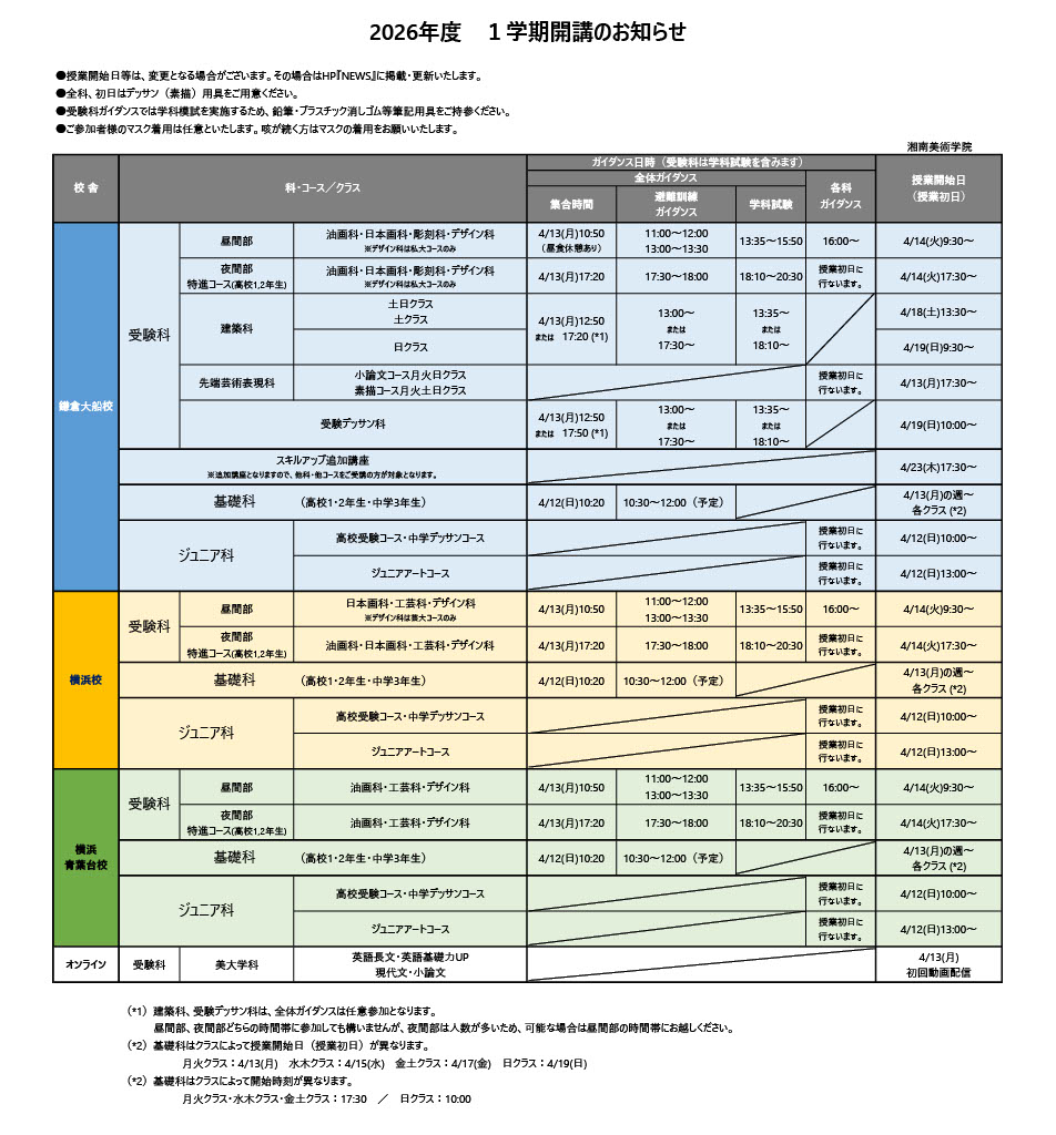 ※先端芸術表現科・受験デッサン科・ジュニア科の各科ガイダンスは、初日授業内で行います。
